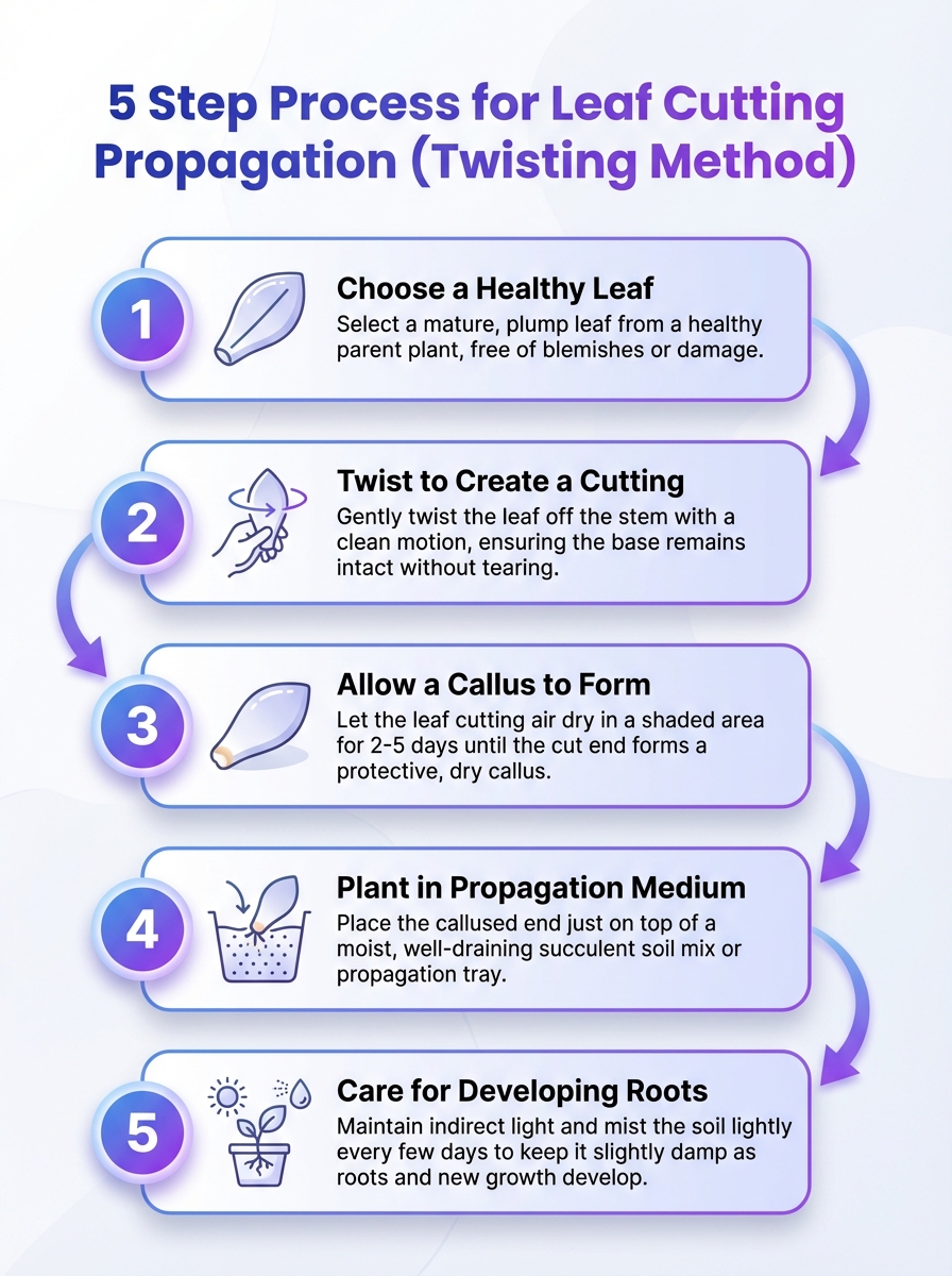 A step-by-step visual guide to propagating plants via leaf cuttings using the twisting method. Learn how to twist correctly to maximize success.